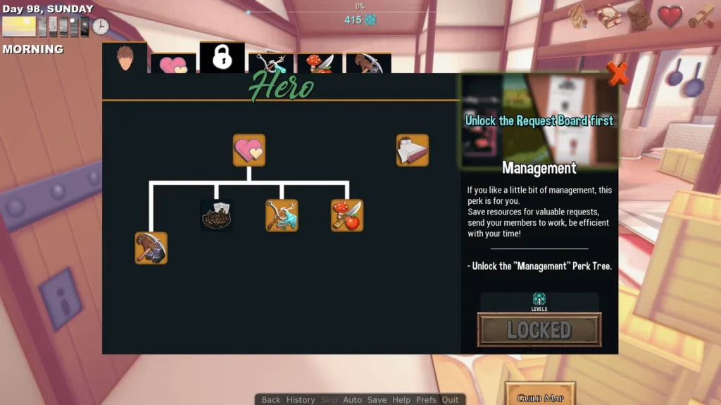 Your primary hub is the guild itself. Here, you’ll manage a few key resources: your reputation, your gold, and most importantly, your time. Each day, you can choose how to spend your energy: improving the guild facilities, talking to your members to deepen relationships, or heading out to the town bulletin board to pick up quests.